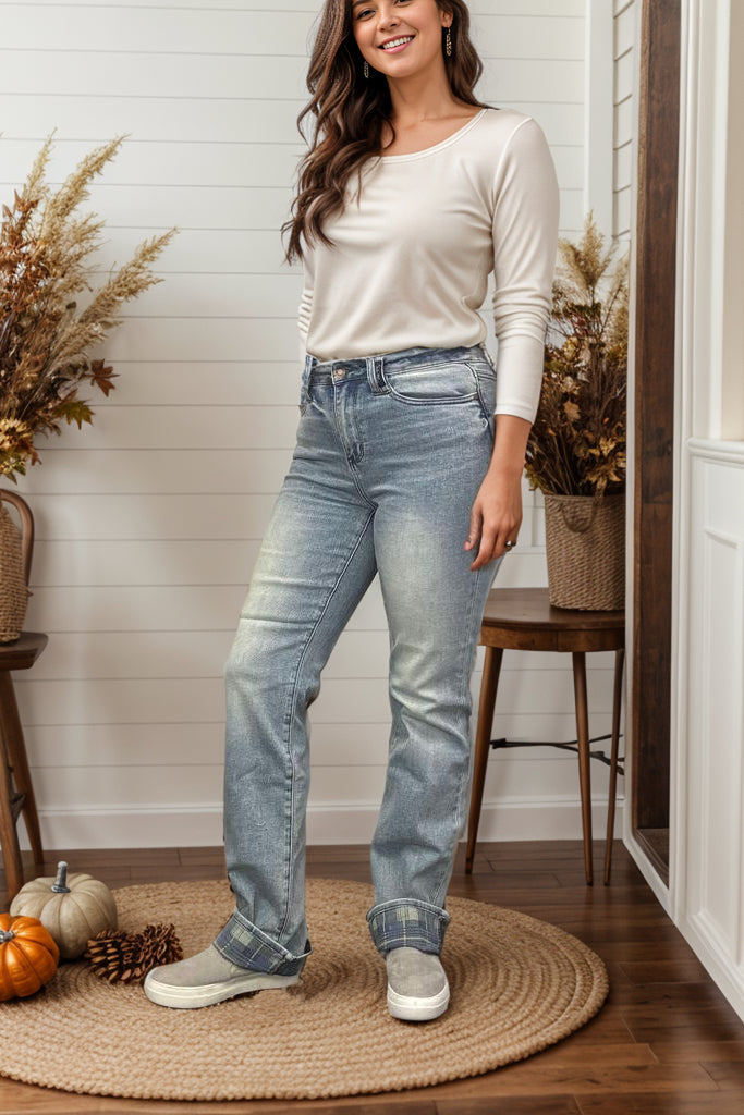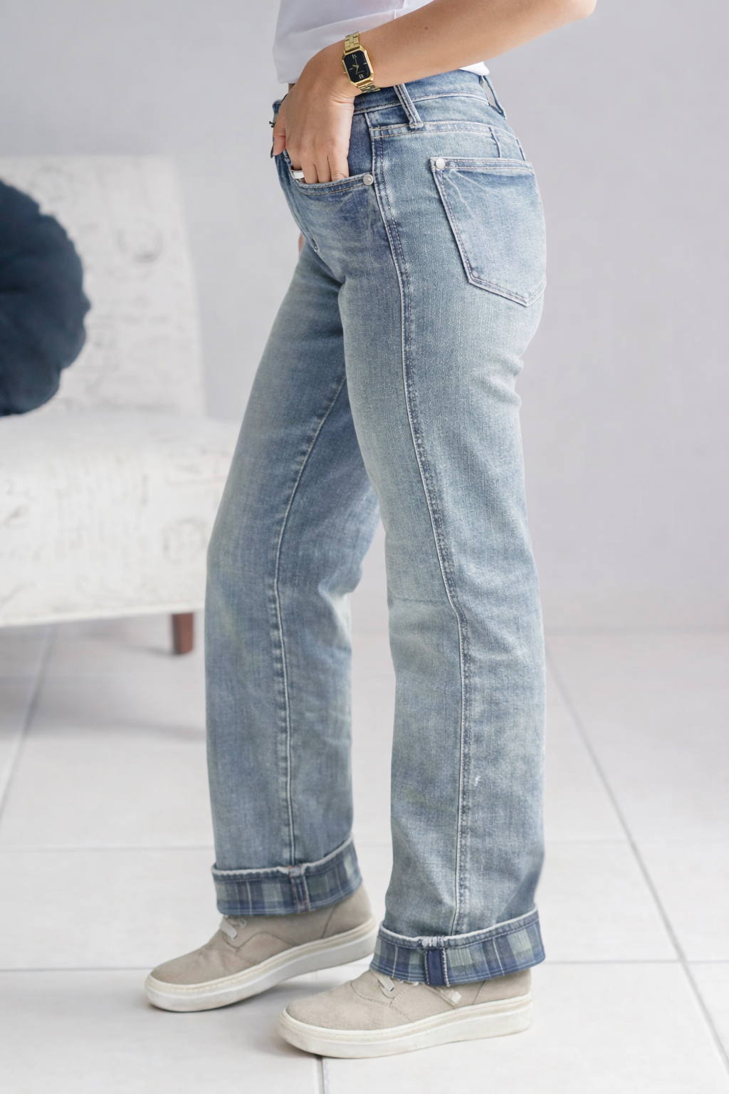 Rock your next look with these fabulously fashionable Judy Blue Jeans! They have an amazing stretch and high waist design to keep you comfy all day, plus a vintage wash and bold plaid cuff for a stylish pop of color. Cuff 'em or uncuff 'em - they're a surefire style hit, no matter what you choose!